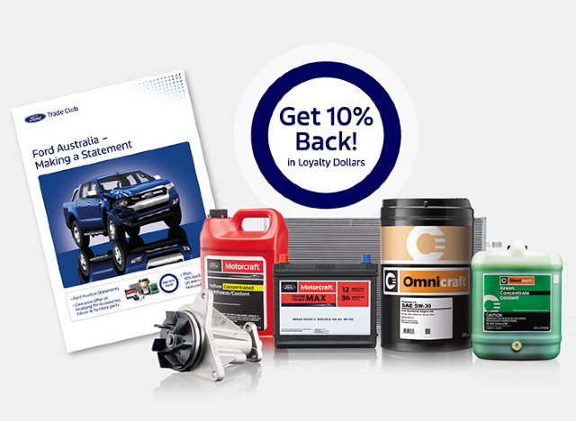 Current Offers *To be eligible to earn Loyalty Dollars, you must be a registered Ford Trade Club Member and have accepted the Loyalty Dollars T&Cs Sign up to Loyalty Dollars Get 10% Back in Loyalty Dollars on any part featured in the new catalogue Learn More Stock Clearance offer on Mustang FM Accessories,Falcon and Territory parts Learn More Get 10% Back in Loyalty Dollars on ALL Batteries, Engine Oil and Coolant Learn More
